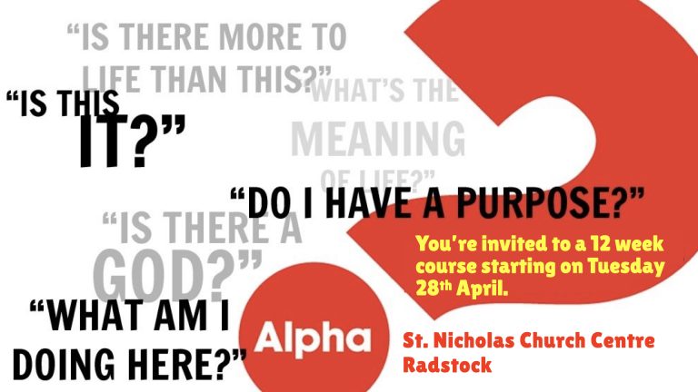 The Alpha Course is held over 12 weeks at St Nicholas Church centre in Radstock. Beginning on the 28th of April 7 – 9.30pm
