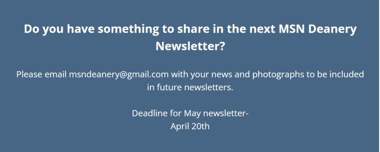 Synod members, please send contributions – including good quality photos – for the next newsletter, and any updated contact details to me at msndeanery@gmail.com